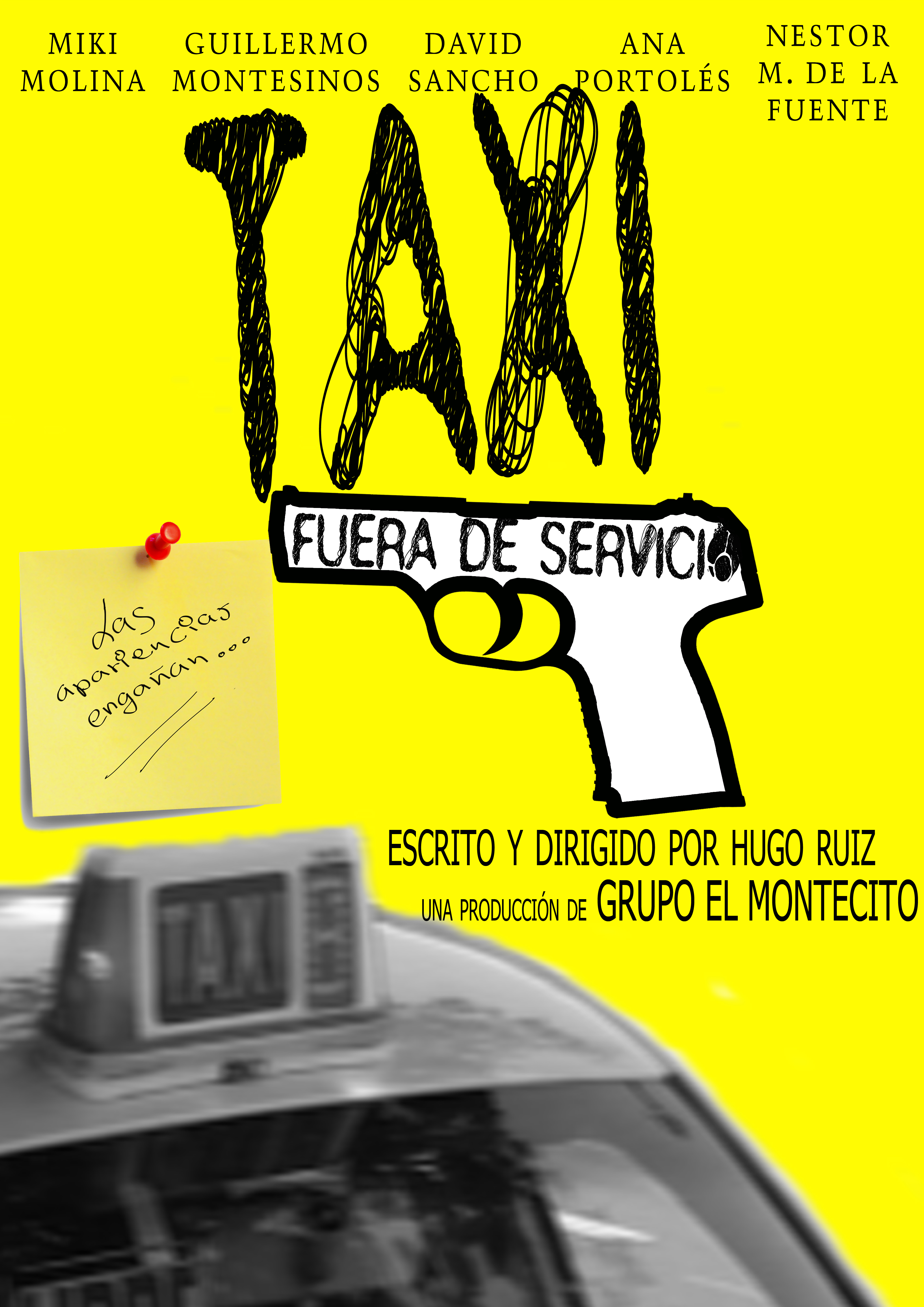 Fuera de servicio para el público claro, porque estará lleno de gente; la gente que forma parte del equipo del cortometraje «TAXI: fuera de servicio». Un guión original lleno de humor y una historia protagonizada por Miki Molina,Willy Montesinos, David Sancho, Néstor M. de la Fuente y Ana Portolés con la que no podrás dejar de reír. Es una crítica de los problemas que vemos en la actualidad pero satirizada al máximo. Cinco personajes dispares y muy diferentes acabarán coincidiendo dentro de un taxi para, al cabo de un tiempo, darse cuenta de que tienen mucho más que ver de lo que ellos pensaban.