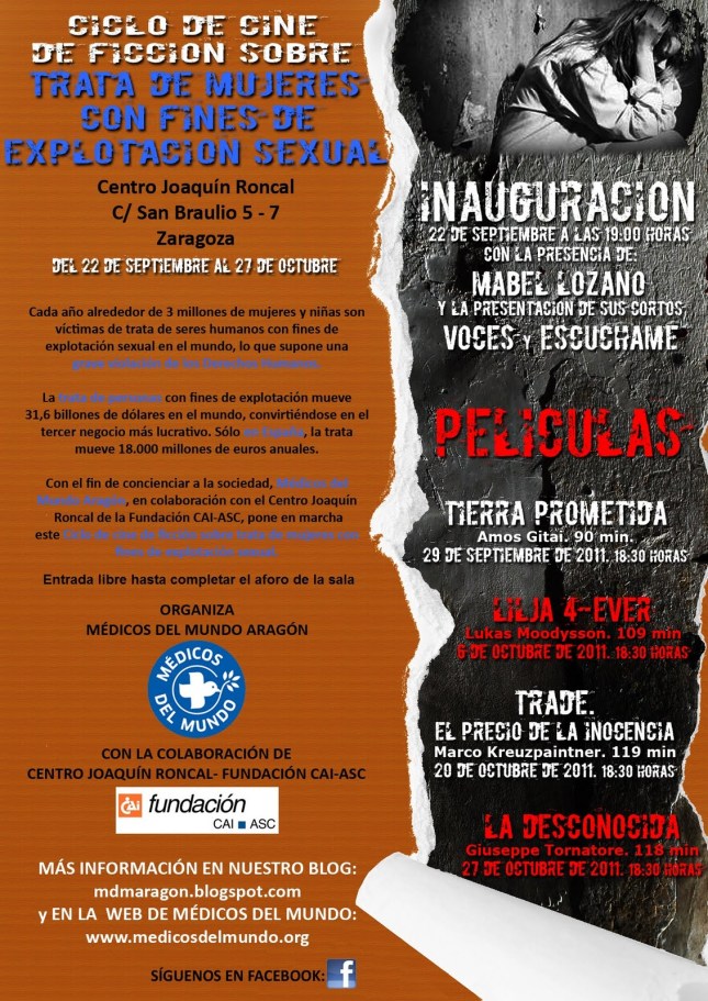 La capital aragonesa estrena nuevo Ciclo Cinematográfico. Esta vez con una temática social que viene con mucha fuerza para enseñarnos que los problemas siguen ahí, aunque no se hable de ellos. En este caso el : “CICLO DE CINE DE FICCIÓN SOBRE TRATA DE MUJERES CON FINES DE EXPLOTACIÓN SEXUAL”.