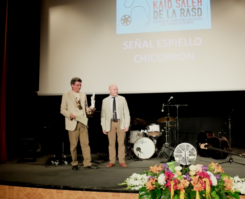 Jesús Maestro recibió de manos del consejero de Cultura de la Comarca de Sobrarbe, Agustín Muñoz el trofeo Espiello Siñal Chicorrón concedido a la Escuela de Cine del Sahara
