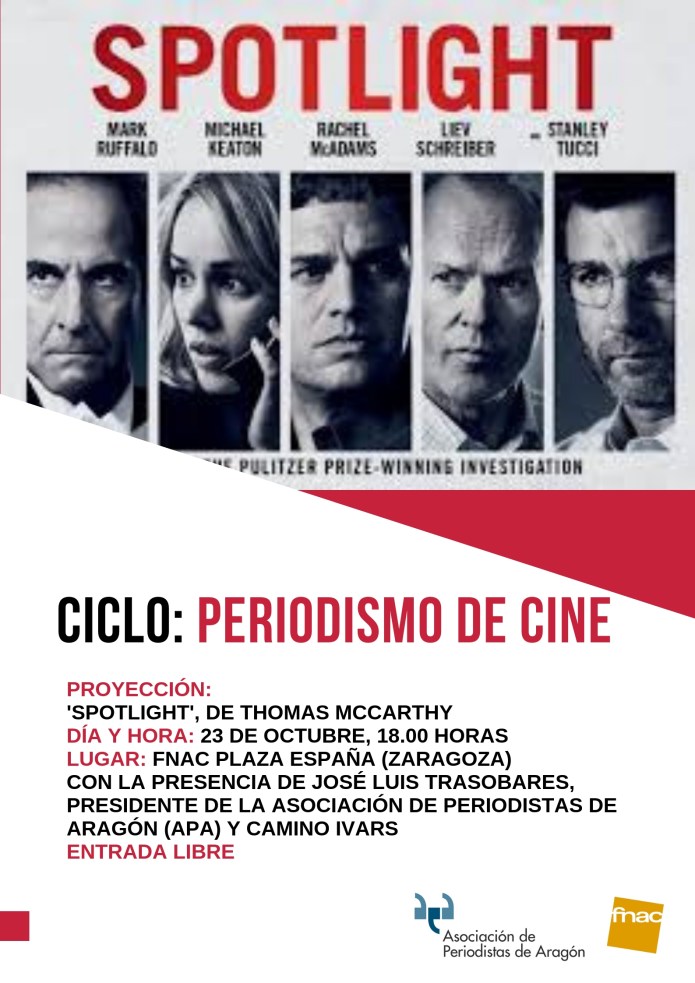 La Asociación de Periodistas de Aragón y FNAC han organizado el ciclo “Periodismo de cine”, que una vez al mes, en el salón de actos de FNAC Plaza España ofrecerá una película de temática relacionada sobre la profesión, seguida de un coloquio con periodistas, con entrada libre para todo el público interesado. El ciclo se abre el día 23, a las 18.00 horas, con la proyección de “Spotlight”; el presidente de la APA, José Luis Trasobares, presentará el ciclo y la periodista Camino Ivars conducirá el debate posterior.