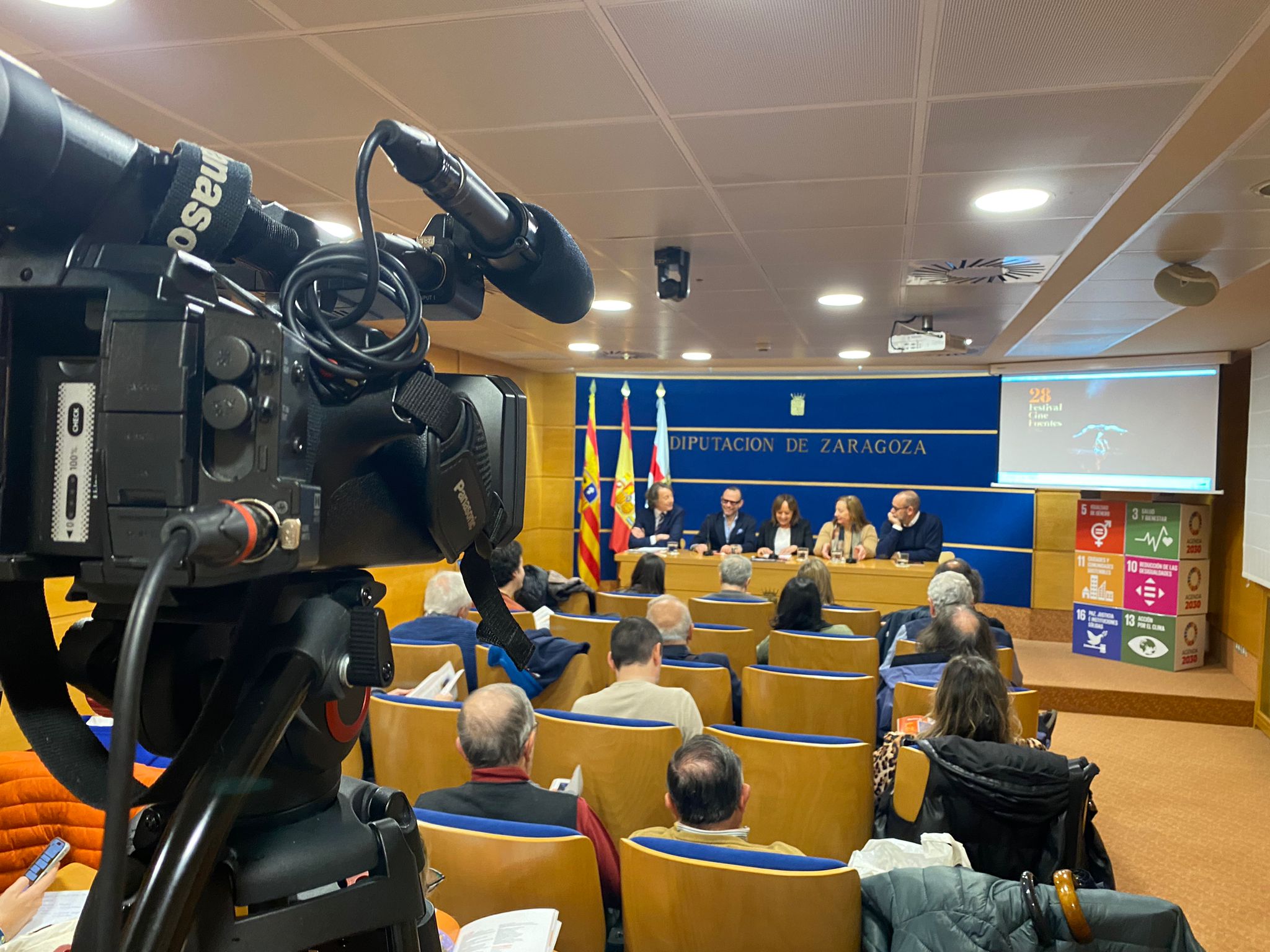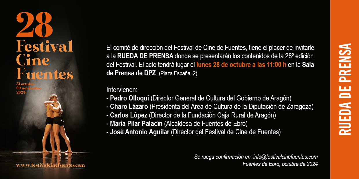 Este lunes, 28 de octubre, la sala de prensa de la Diputación Provincial de Zaragoza (DPZ) era el lugar elegido para dar a conocer el programa completo y las novedades de la vigesimoctava edición del Festival de Cine de Fuentes. Una cita a la que acudían José Antonio Aguilar, director del festival, Pedro Olloqui, Director General de Cultura del Gobierno de Aragón, Charo Lázaro, presidenta del área de Cultura de la Diputación Provincial de Zaragoza, Carlos López, Director de la Fundación Caja Rural de Aragón y María Pilar Palacín, alcaldesa de Fuentes de Ebro.