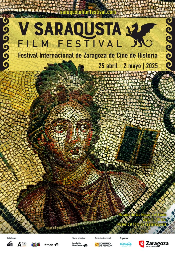 El cartel de Saraqusta Film Festival combina elementos culturales e históricos de manera creativa. Este año, el diseño ha corrido a cargo del responsable de la imagen del festival David Arenasy de la coordinadora de programación Patricia Naya, y muestra, a propuesta del Ayuntamiento de Zaragoza, un fragmento del mosaico romano ‘Las musas y el fauno’, fechado en los siglos II/III D.C, que se encuentra en el Museo del Foro de Caesaraugusta.