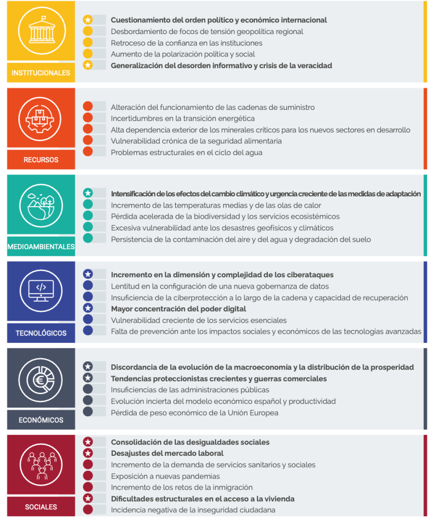 El informe alerta de 33 riesgos que pueden impactar en las empresas españolas en 2026, que se ha agrupado en 6 ámbitos: institucionales, recursos, medioambientales, tecnológicos, económicos y sociales. El objetivo es ayudar a las empresas a visualizar retos y obstáculos para la adopción de medidas preventivas y la toma de decisiones estratégicas.