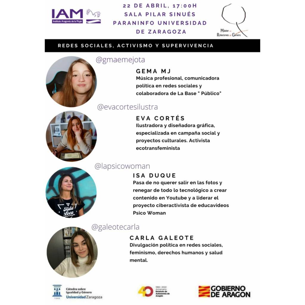 Este viernes, 22 de abril, a las 17.00 horas, la sala Pilar Sinués del edificio Paraninfo de la Universidad de Zaragoza alberga la mesa redonda ‘Feminismo para vivir. Redes, activismo y supervivencia’. Se trata de un acto organizado por el Instituto Aragonés de la Mujer (IAM) en colaboración con la Universidad de Zaragoza.