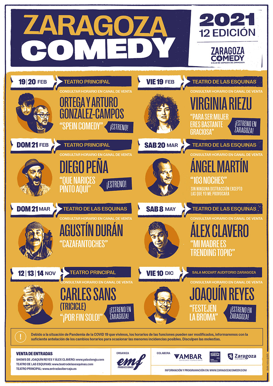 EMF Producciones presentaba esta mañana en el Espacio ÁMBAR de la capital aragonesa la XII edición del Festival Zaragoza Comedy. El director de la muestra de comedia más consolidada de Aragón, Rafael Sánchez-Rubio, estaba acompañado por el barcelonés Juan Carlos Ortega y el cómico local Diego Peña. “Después de doce años podemos decir que el Zaragoza Comedy es un proyecto más que consolidado, sobre todo por el año de pandemia que nos ha tocado vivir”, afirma Sánchez-Rubio, que recuerda que “los horarios están supeditados a la evolución de la crisis sanitaria”.
